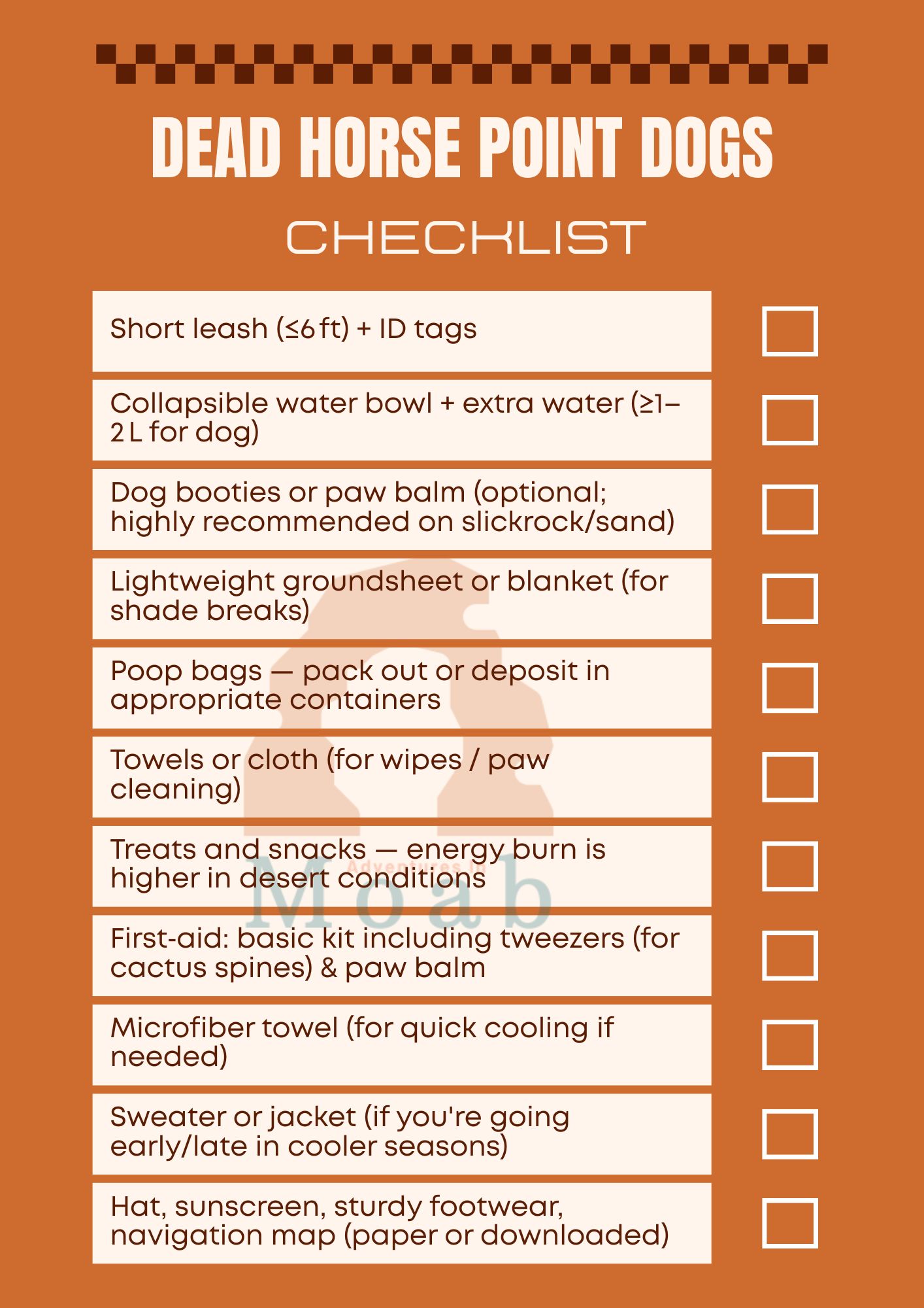 - Consider dog booties or paw balm for slickrock/sand surfaces.
